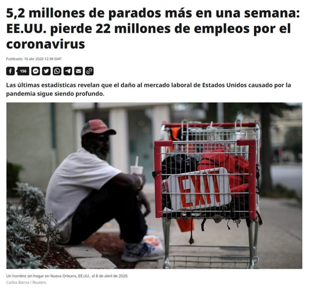 Millones de empleos se han perdido y es una situación nada alentadora en la nación más poderosa del mundo, su Estado se ha preocupado por gastar astronómicas cantidades de dinero en el complejo industrial militar, para mantener el negocio a las élites como se menciona anteriormente, sin embargo no tienen sanidad pública y ahora deben mantener 22 millones de personas sin trabajo.