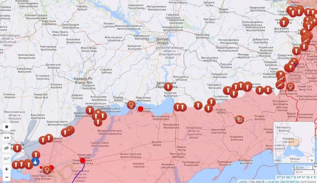 La autoflagelación de la prensa occidental, escapa a los análisis del psiquiatra más ilustrado. Ucrania prosigue su contraofensiva para repetir su éxito de Járkov. «Ucrania intenta extender al Donbáss y Jersón el éxito de su contraofensiva en Járkov cuando han transcurrido 206 día de guerra». ¿Pero de qué habla esta gente?, ¿no son capaces de ver un mapa?, este de la foto, es hecho por un sitio por ucraniano. No existe ninguna actividad militar ucraniana.