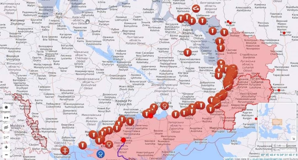 Foto: Actividad militar en el terreno, 26/09/2022. Rojo la actividad militar rusa, azul la ucraniana. El mapa es hecho por un sitio pro ucraniano. No uso el de los pro rusos, al igual que sus textos en las noticias, para precisamente, hacerlos picadillos con sus dichos, sus hechos y su propaganda. Del resto, se encargan los rusos.