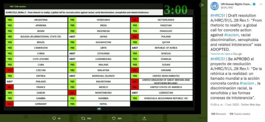 Foto: el cinismo occidental en pleno apogeo. Esta votación tuvo lugar en el Consejo de DDHH de la ONU. Vea bien qué se votaba y quienes votaron contra y a favor. Ese es el mundo que hay que cambiar.