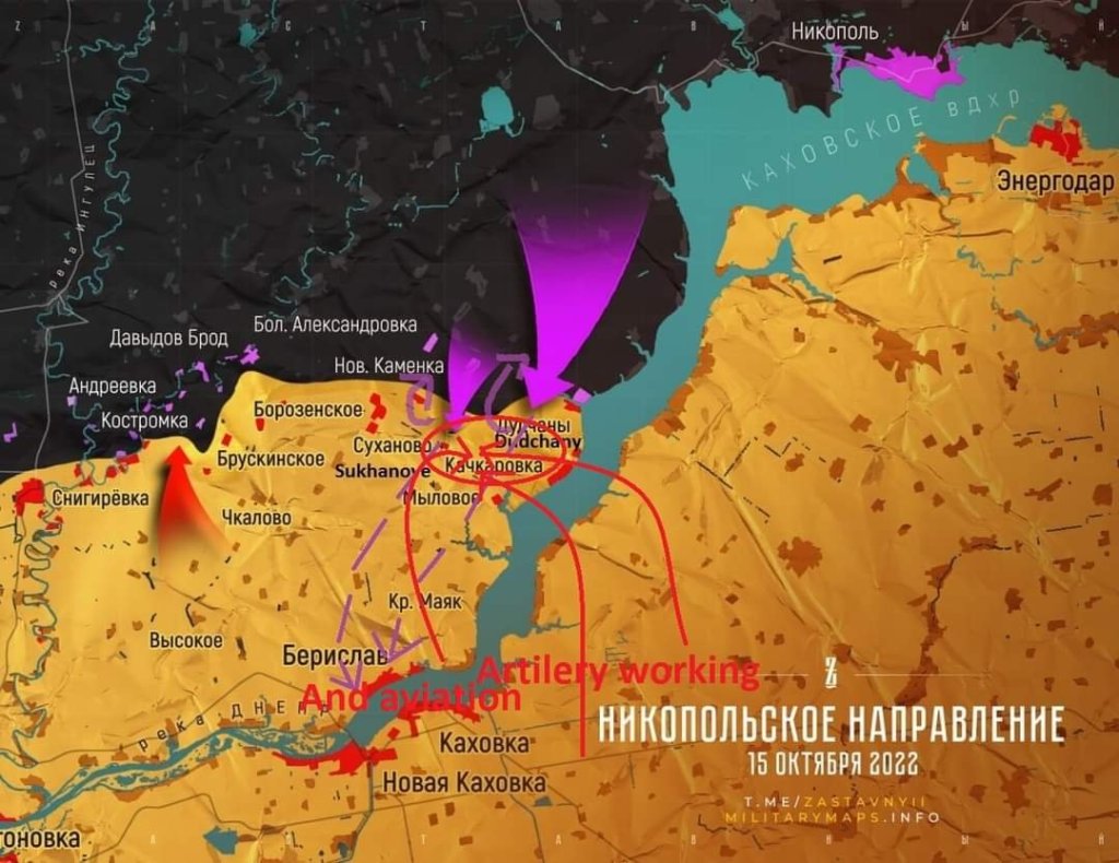 Kherson. El ataque le costó al ejército ucraniano al menos 120 muertos. Unos 15 vehículos blindados YPR-765PRI y BMP-2 y al menos cuatro tanques T-64BV fueron destruidos. A media tarde del 15 de octubre, las unidades de las AFU se habían empantanado en el ataque e intentaban retirarse, ahora resulta que ni huir pueden. Y entonces, de querer volver a sus posiciones originales, en las que habían comenzado a operar los aviones de ataque Su-25 y Su-34 de la Fuerza Aérea Rusa, se encuentran al medio, con bajas por todos lados.