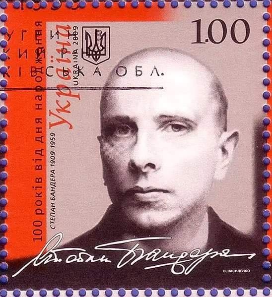 Foto: Este es un sello de Ucrania. En él aparece Stepán Bandera, responsable durante la segunda guerra mundial del asesinato de decenas de miles de judíos, polacos, partisanos, etc. Era más racista que Hitler y es un dios para Zelenski. Ukronazis.