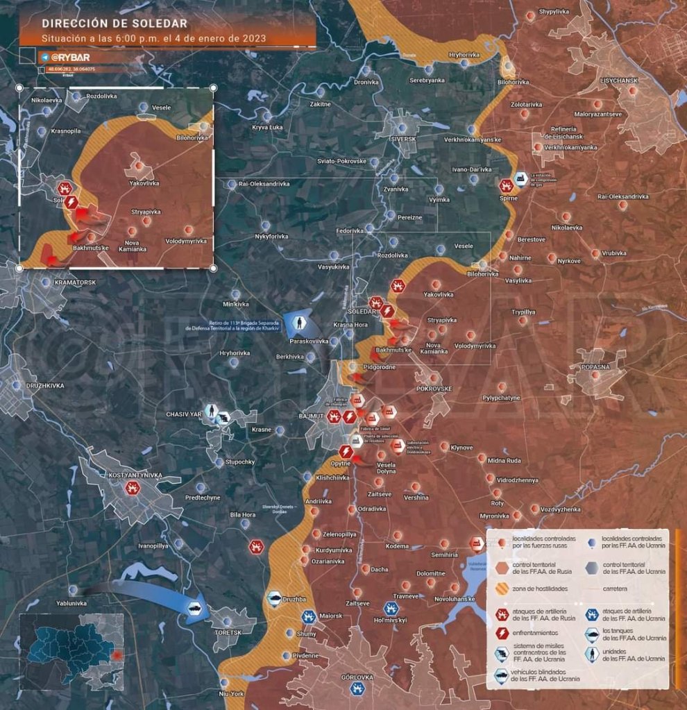 Foto: Situación operativa 04/01/2023, en la zona Siversk, Soldar, y Bakhmut. Se ha retirado la 113a Brigada Separada de Defensa Territorial a la región de Kharkiv. Hay avances sustanciales en Soledar, los ucranianos tendrán que ver allí qué defienden, ¿el norte? Siversk, ¿el centro? Soledar ¿o el sur? Bakhmut.