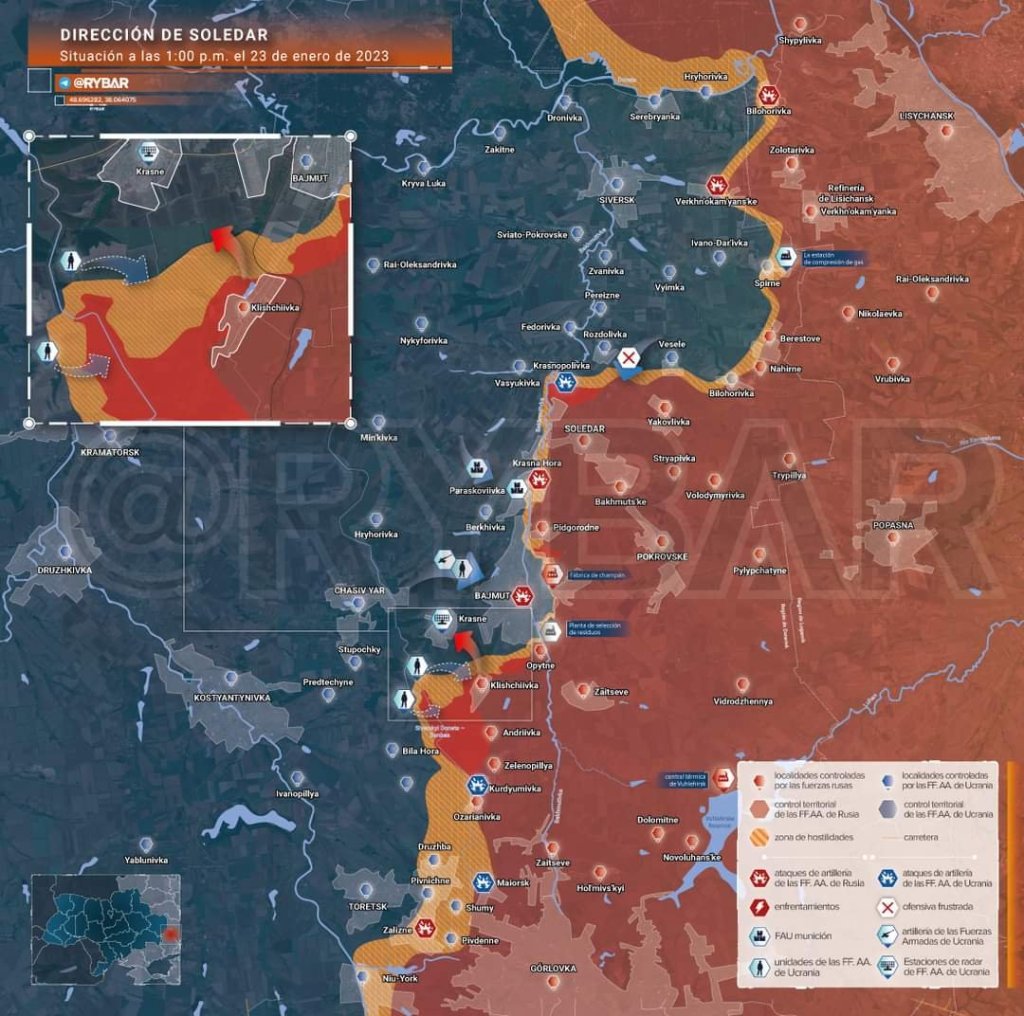 Foto: Dirección Soledar – Bakhmut. Los rusos están haciendo un buen movimiento táctico al sur, los ucranianos se dieron cuenta y están enviando más refuerzos, están faltos de reservas, es probable que hayan desplazado tropas desde Zaporizhia y también de Malinka, donde los rusos avanzan. Observen bien el mapa, los ucranianos quieren evitar que los rusos lleguen a Chasiv Yar, mientras que estos ya están atacando Krasne.