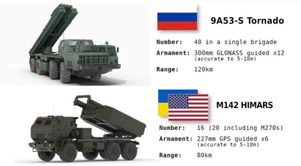 Foto: Un comparativo de armas equivalentes, este es un BM más, el 9A52-4 Tornado, aunque es la versión más ligera del BM-30 Smerch, normalmente debe reemplazar al BM-27 y también el BM-21 que ya está viejito. La combinación perfecta es Tornado con Smerch. Ambos, por alcance, y cadencia, pueden dar un empleo estratégico y táctico, dentro de la «Doctrina Guérasimov», que son los Батальонная тактическая группа, Grupo Táctico de Batallón. Que han demostrado una eficacidad remarcable en el terreno, en particular, en las comunicaciones, porque requieren mucha coordinación.