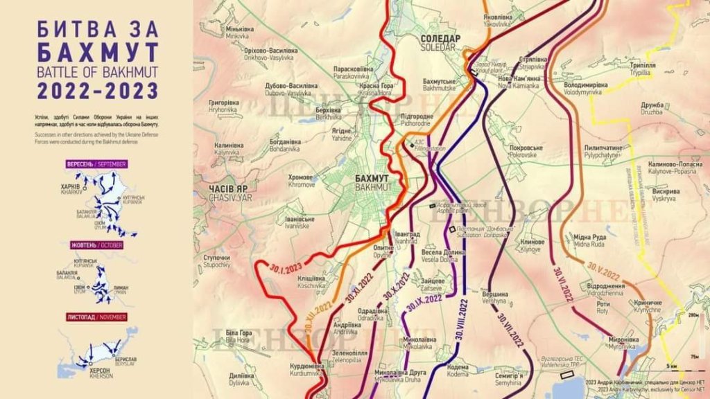 Foto: Evolución del frente Bakhmut – Soledar en 11 meses, fecha por fecha. Ahora que digan que van ganando la guerra, los rusos han sido metódicos, disciplinado, fuertes e inteligentes. Es cosa de mirar la evolución en el mapa. Y desde hoy, están las fuerzas ucranianas, en un cerco operativo.