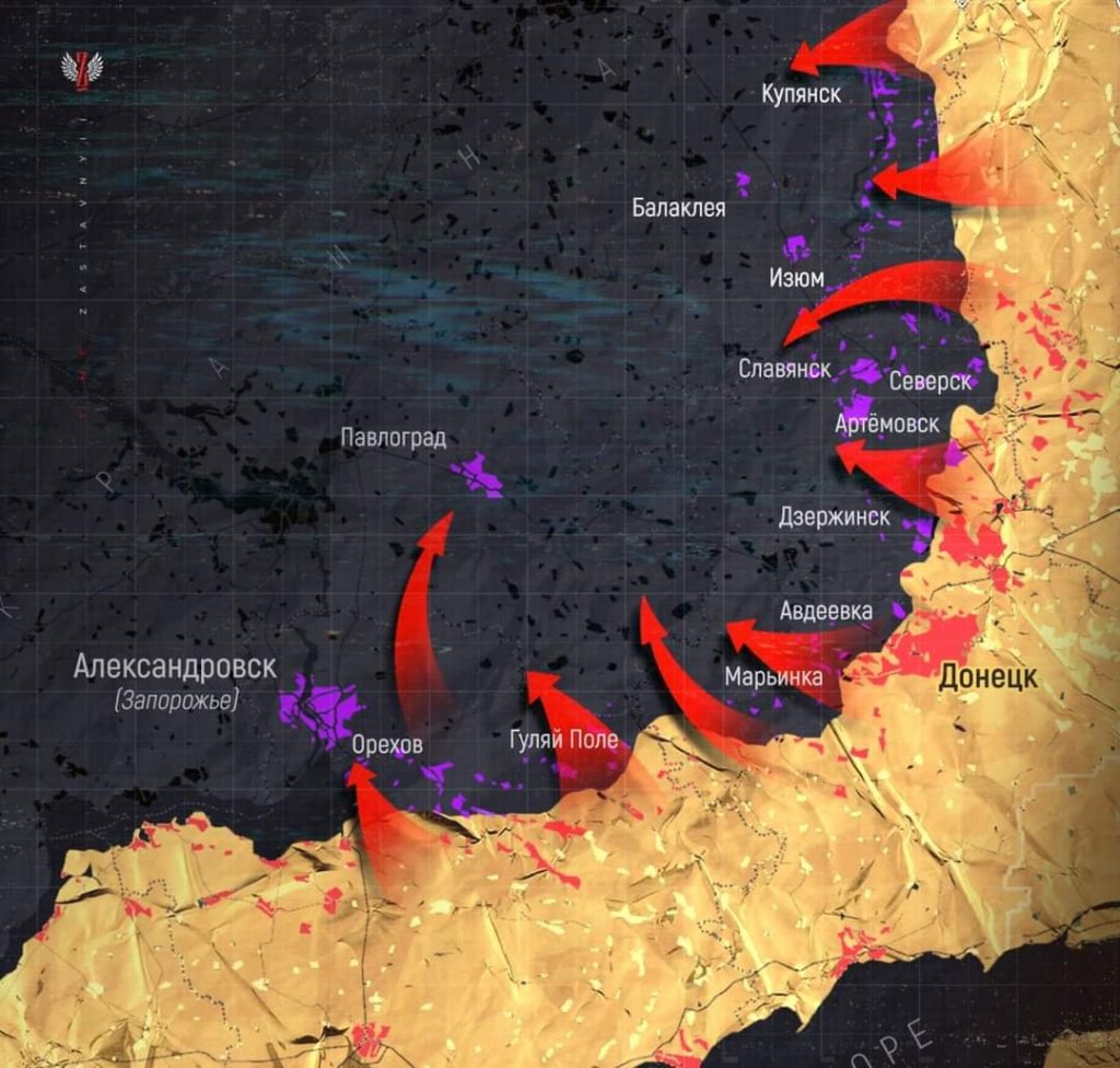 Foto: Predicciones, muy de acuerdo. Como lo dije hace 3 días, Kramatorsk será tomada desde el sudeste y también desde el norte. Pero la dirección que más me interesa es la primera abajo, hacia Zaporizhia, ese movimiento, en esta etapa, garantiza la recuperación de la totalidad de Kherson, y sobre todo, abre la posibilidad de una ofensiva sobre Mykolaiv y Odessa.