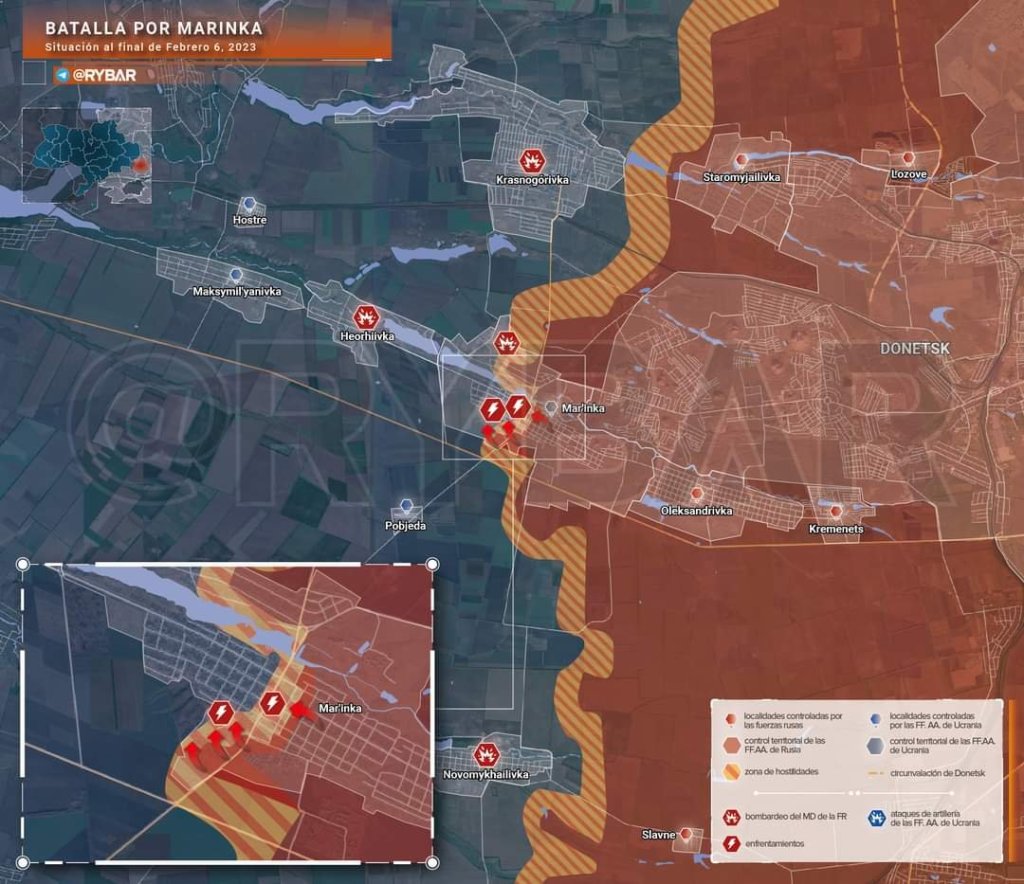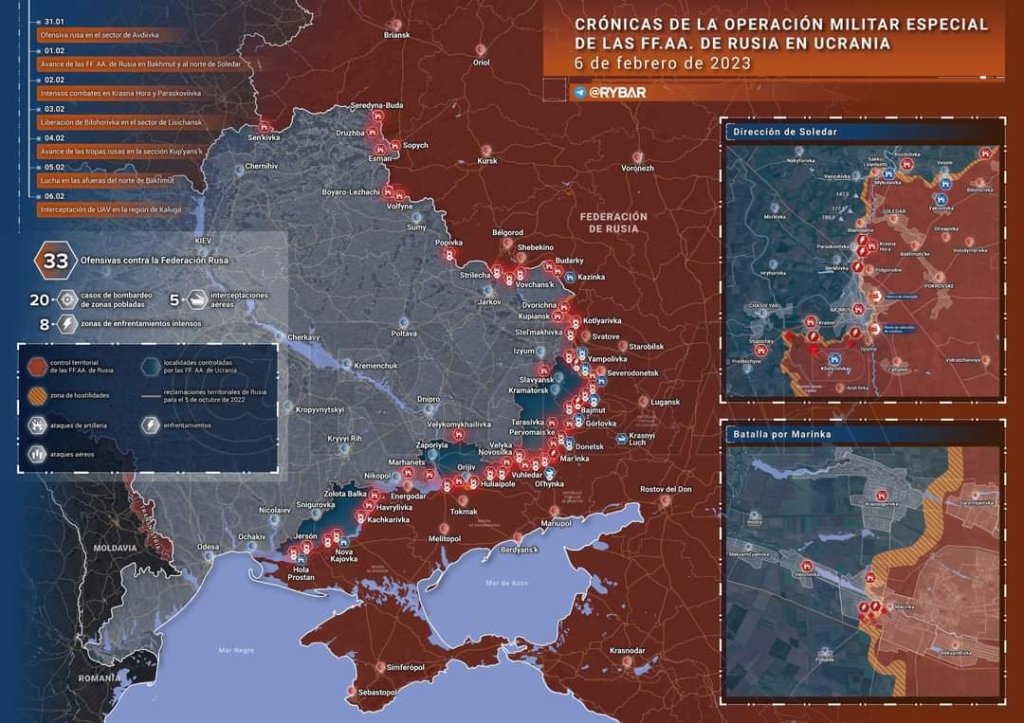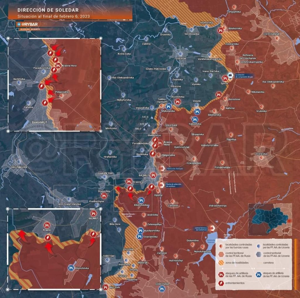Foto: Situación operativa en los diferentes frentes. Al 06/02/2023. Es decir ayer. Agrego en alta definición, dos frentes en específico, Artemovsk – Soledar, y Malinka.