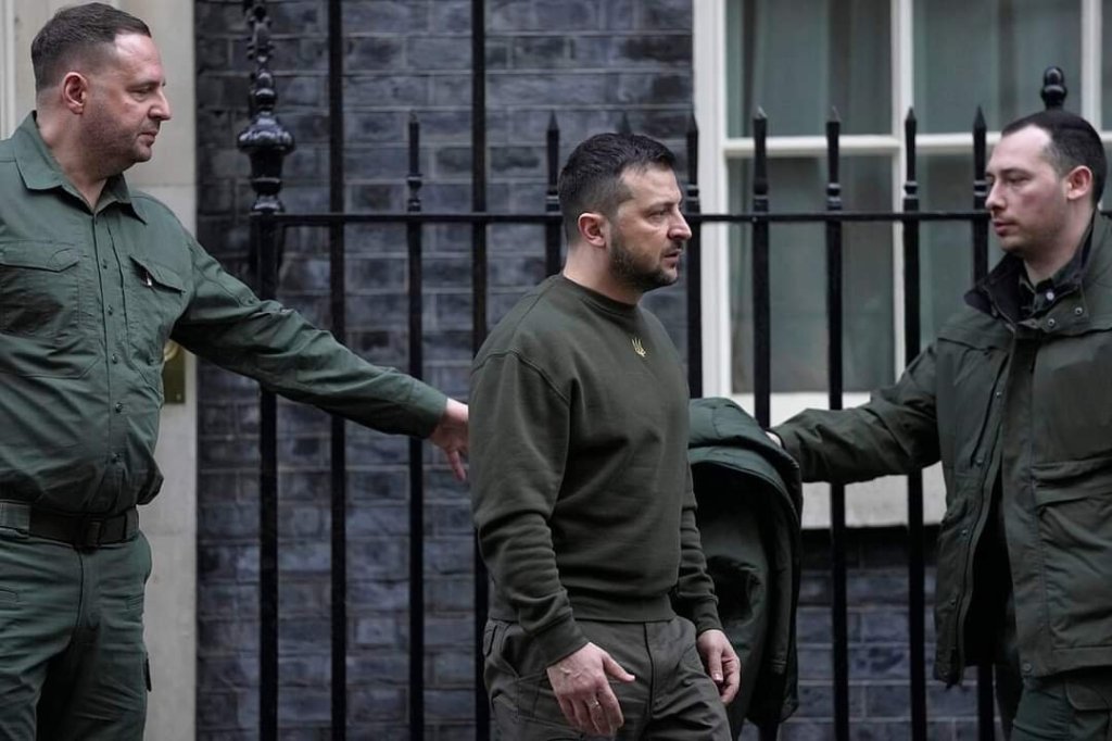Foto: Zelensky y su séquito saliendo del 10 Downing Street, en Londres, Inglaterra. La semana pasada, cuando se produjo la reunión de los comisarios de la Unión Europea en Kiev, todas las delegaciones recibieron una extraña nota vestimentaria de parte de Kiev, nadie podía vestirse con los colores «kaki» o verde olivo. La intención es remarcar que sólo ellos, pueden vestirse así, lo divertido de esto, es que ninguno de la camarilla que rodea a Zelensky, ha sido militar en toda su vida. Y así se pasean, como falsos militares.