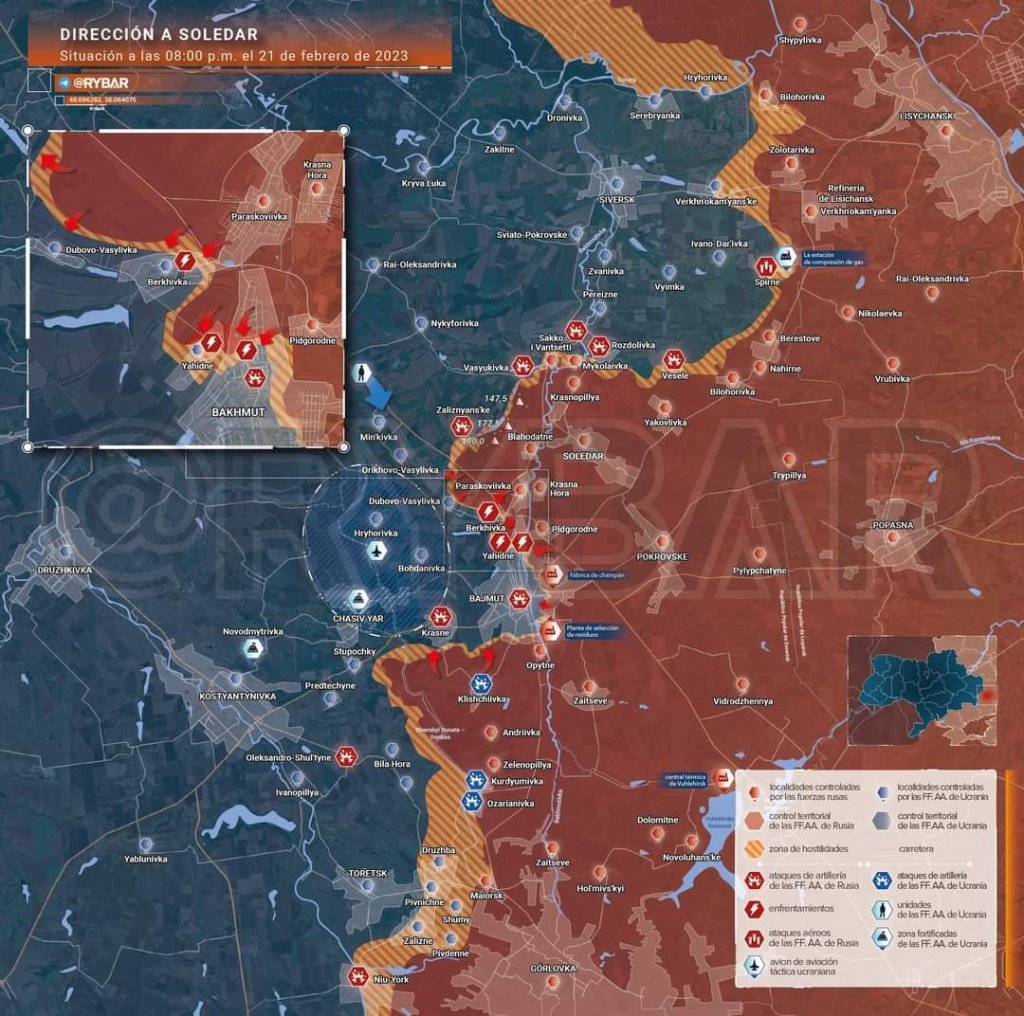 Foto: Situación dirección Soledar a las 20.00 horas del 21 de febrero de 2023 según Rybar. En el norte de Bakhmut, los destacamentos de asalto de los PMC de Wagner avanzaron hacia la planta de procesamiento de metales no ferrosos de Bakhmut, donde se atrincheraron formaciones ucranianas. El asalto al territorio de la empresa se complica por la presencia de una red desarrollada de servicios públicos subterráneos.