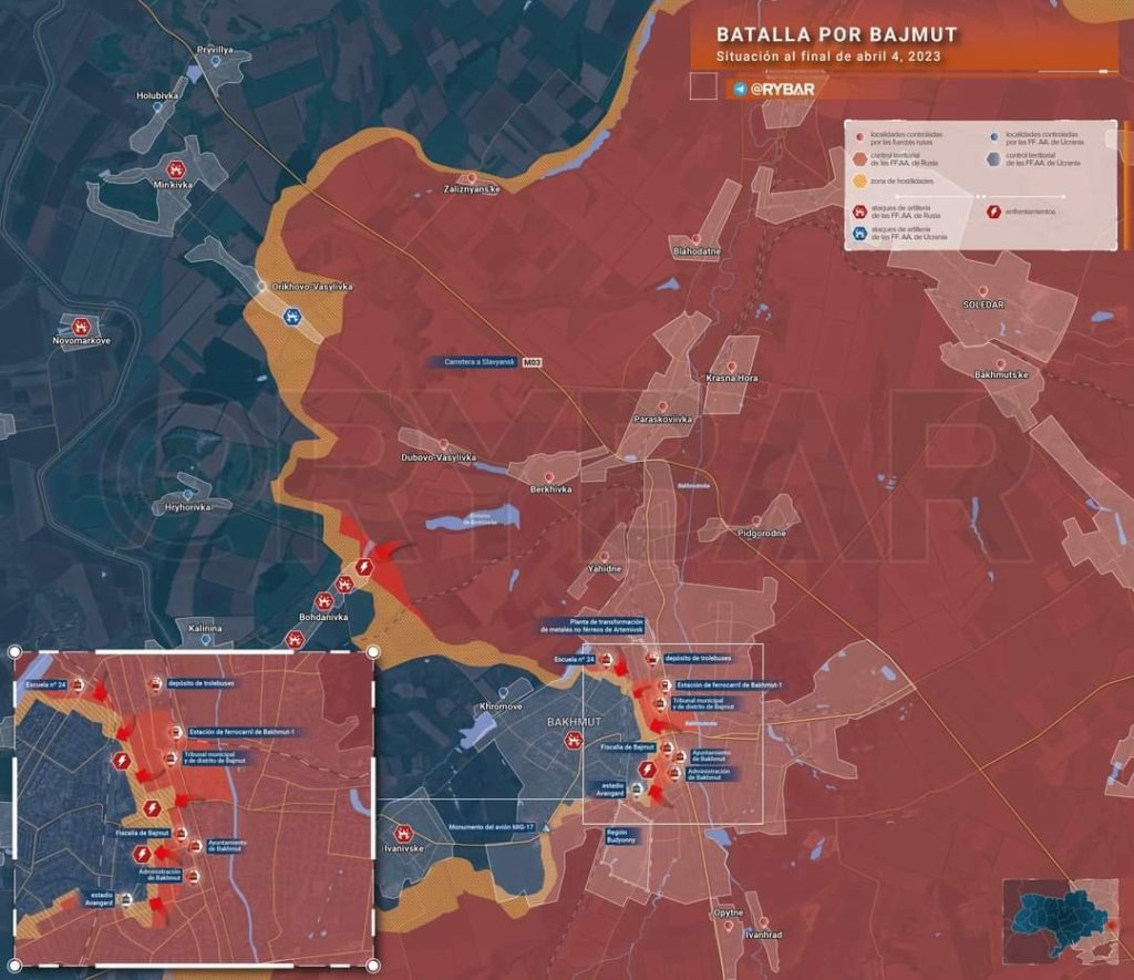 Foto: Bakhmut, 04/04/2023 (ayer), ya aquello está en el final, la Escuela N°24 está en manos rusas, absolutamente toda la zona industrial del norte y centro de la ciudad, todos los edificios administrativos, el depósito de trolebuses, la Estación de ferrocarril de Bakhmut-1, Tribunal Municipal y de Distrito de Bakhmut, el Ayuntamiento, la Administración, la Fiscalía y el estadio Avangard. Todo en manos rusas, solo se refugian en el último cuadrado de la zona residencial del oeste de la ciudad.