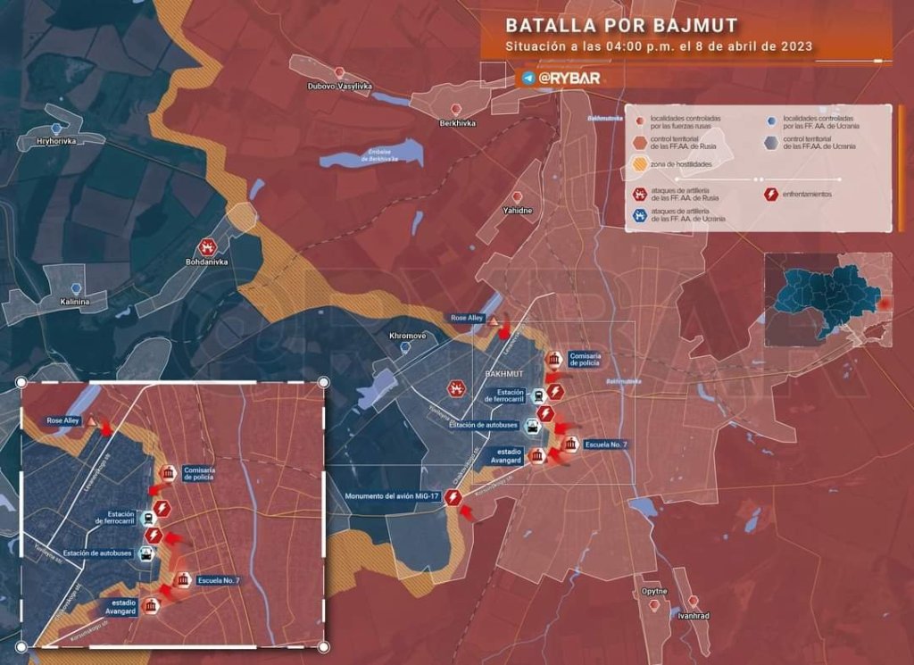 Foto: Situación en Artimovik a las 16:00, 08/04/2023. Ya el monumento al Mig al sur de la ciudad está en manos de lso rusos, no fueron enviados contigentes ucranianos en refuerzo, se avanzó y consolidó «Rose Alley», por el noroeste, y creo que van ahora a avanzar hacia Khromove y cercar completamente, pero esas fuerzas de noroeste, seguirán hacia el oeste, en dirección de Bohdanivka, que tiene una altura necesaria para dominar Chasiv Yar. Las fuerzas rusas que vienen limpiando de este a oeste y de norteste, serán las que expulsarán, esta semana, lo que les queda allí, que no sobrepasa el 20%. Como lo dije en enero, los rusos van por Kostiantynivka.