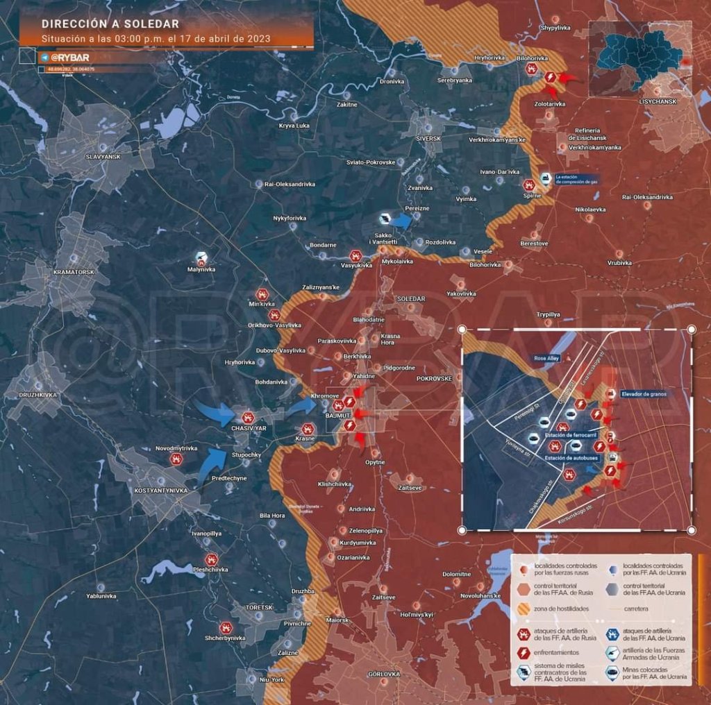 Foto: Artemovsk hoy 17/04/2023 a las 15:00 pm hora rusa. El ejército ucraniano sigue insistiendo en su locura de enviar más refuerzos a un lugar que no va a conquistar, ni siquiera defender, consideran ellos estratégico hacer demorar la caída. Los rusos comenzaron a usar bombas de 500 kilos, ya se hicieron con el Elevador de Granos, la estación de trenes, la de Autobuses, para que tengan una idea ya del rincón en que se encuentran, el último camino que tienen cortado el T-0506, o bien O0506, es el mismo, y en la foto, estando dentro de la ciudad, es el que se llama Yuvileyna Str., allí se acaba Artemovsk. Han minado bastante el último padazo de territorio que controlan.