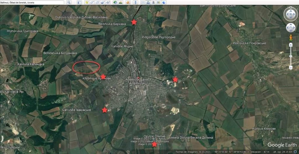 Les dejo 4 fotos, tres que muestran las trincheras y sus consecuencias, más otra, que hago de inmediato. Es el camino que siempre les dije se dejaría para el final, O-0506. Las fotos de la situación al oeste de de la carretera O-0506 Chasov Yar – Khromovo, es la curva, la foto grande es de antes, las otras de ahora. En la grande puse las estrellas para que vean los bordes de toda la ciudad, actualmente los ucranianos no controlan más del 10%, eso hasta ayer, no hoy, estoy informándome.