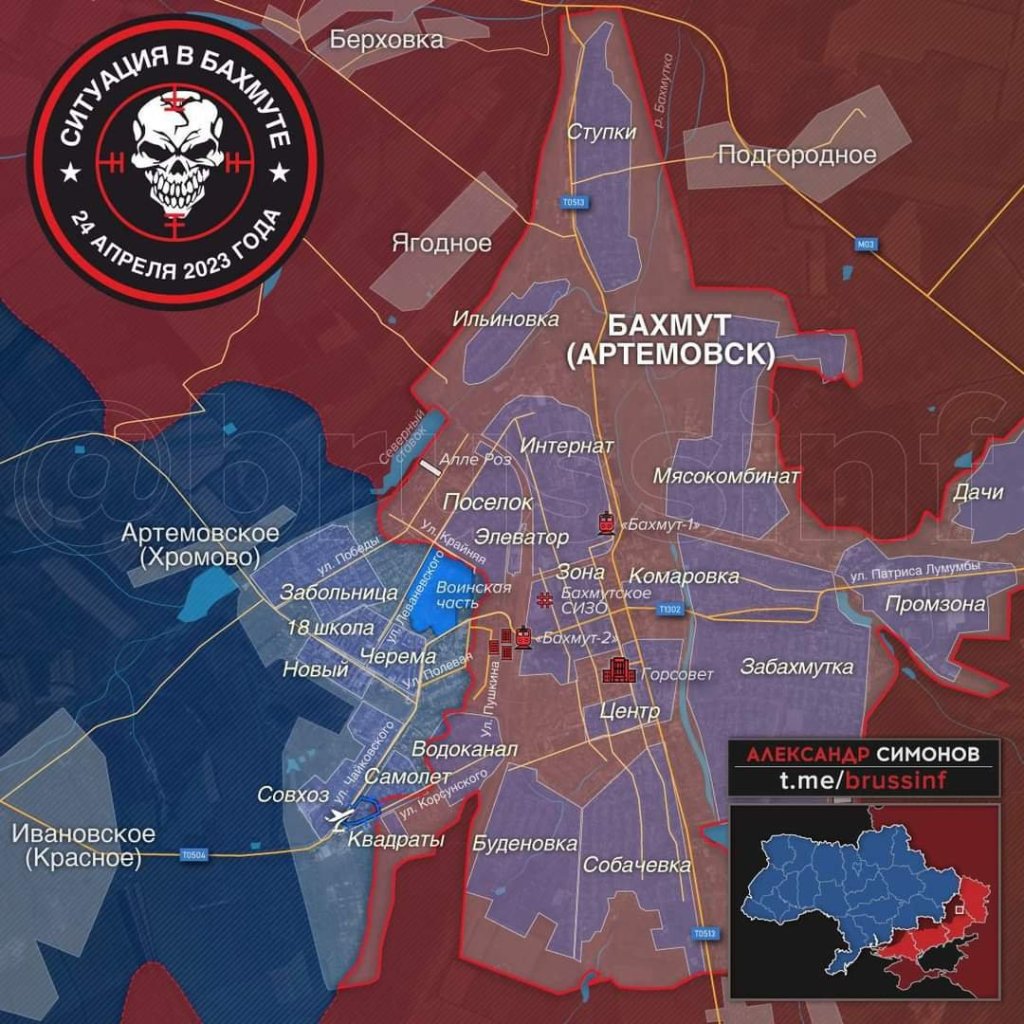 Foto: Avance de la PMC «Wagner» en Artemovsk en la tarde del 24 de abril. Ahora el foco principal de la lucha se ha desplazado a establecer el control sobre la unidad militar junto al bloque de edificios de gran altura. En el noroeste de Bakhmut, unidades de la PMC «Wagner» ocuparon la línea a lo largo de la calle Kraynaya y continuaron avanzando hacia el distrito de Zabolnitsa. El área de asentamiento está casi completamente controlada por los músicos.