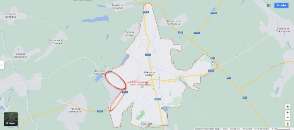 Foto: La esquinita que la queda a los ucronazis en Bakhmut (le llamaré Artemivsk cuando se haya ido o aniquilado hasta el último ucronazi. Encontré la mejor foto que muestra los límites administrativos de la ciudad, bien demarcados, es para que tengan una idea del trabajo hecho por los rusos.