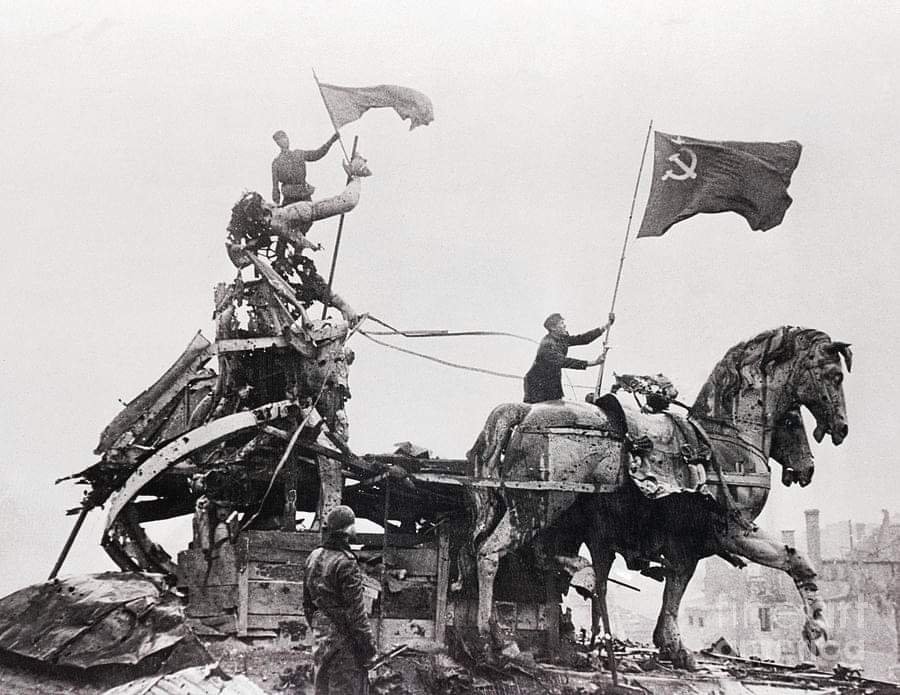 Foto: El ejército rojo, no solo colocó la bandera de la Victoria sobre el Reichstag, también fue a la Puerta de Brandenburgo y homenajeó a Johann Sebastian Bach con la bandera de la URSS (esos son interpretaciones mías), pero la foto, es lo es.