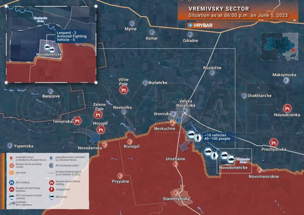 Foto: Dejaremos los partes de Rybar. La situación en la dirección del sur de la RPD a las 14:00 del 5 de junio de 2023. En la frontera entre la región de Zaporozhye y la RPD, en el área del saliente de Vrémievski, las Fuerzas Armadas de Ucrania reanudaron el asalto a las posiciones rusas. Ayer, al final del día, las Fuerzas Armadas de Rusia recuperaron los territorios perdidos, incluido Novodarovka.