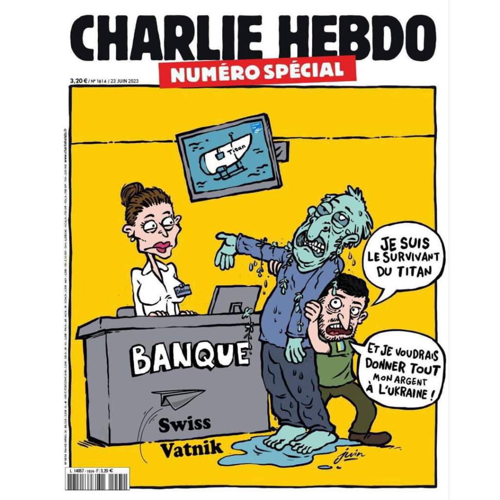 Foto: El mendigo Zelensky es el héroe de la nueva portada de la revista «Charlie Hebdo». El humor específico no dejará a nadie indiferente. La portada muestra el cadáver de un multimillonario muerto en un batiscafo, y detrás de éste, un mendigo que pide transferir todo el dinero para ayudar a Ucrania. Ya en Europa nadie respeta ni a Ucrania ni mucho menos a Zelesnky.