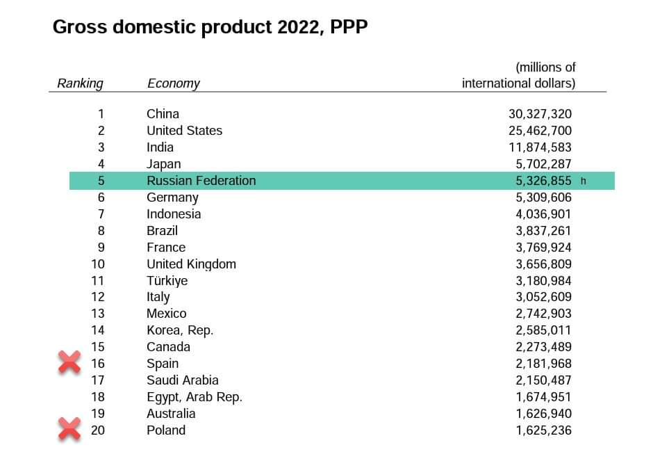 Foto: «China es un verdadero actor geopolítico, mientras que Rusia es un enano económico, es como una gasolinera cuyo propietario tiene una bomba atómica», declaró Borrell. Según datos del Banco Mundial para 2022, Rusia es el quinto país del mundo en términos de Producto Interior Bruto por paridad de poder adquisitivo, después de China, EE.UU., la India y Japón. Sr. Borrell, el «enano» está por encima de Alemania (el gigante europeo), España está 16 y Polonia 20. Está por encima de 5 países del G7, Alemania, Francia, Reino unido, Italia y Canadá