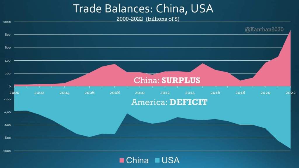 Foto: Estados Unidos ha estado viviendo del arduo trabajo de las naciones en desarrollo, gracias al extraordinario e injusto privilegio del dólar. Pero la desdolarización ha comenzado, fue el tema principal de la expansión #BRICS. Balanza comercial: Estados Unidos contra China. Un país trabajando duro; otro país imprimiendo dinero y comprando cosas. Este viaje gratuito está llegando a su fin.