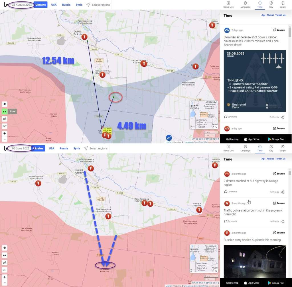 Foto: La mentira ucraniana, dicen haber avanzado 10 km hacia el sur, falso, efectivamente hay 10, no, para ser exactos, 12.54 km entre Orikhiv y Robotino, pero, jamás Rusia ha estado Orikhiv, sino mucho más abajo, ustedes puede ver los mapas del 06/06/2023 y el del 26/08/2023, ustedes verán en junio, que las fuerzas rusas controlaban hasta ese dibujo como una bota (como el mapa de Italia), observe bien al día de hoy, ¿cuánto han avanzado en 2 meses y 22 días, 4.49 km, menos de la mitad de lo que pretenden, son unos embusteros y se atreven a decir, para vender: «Que están muy cerca de liberar Crimea».