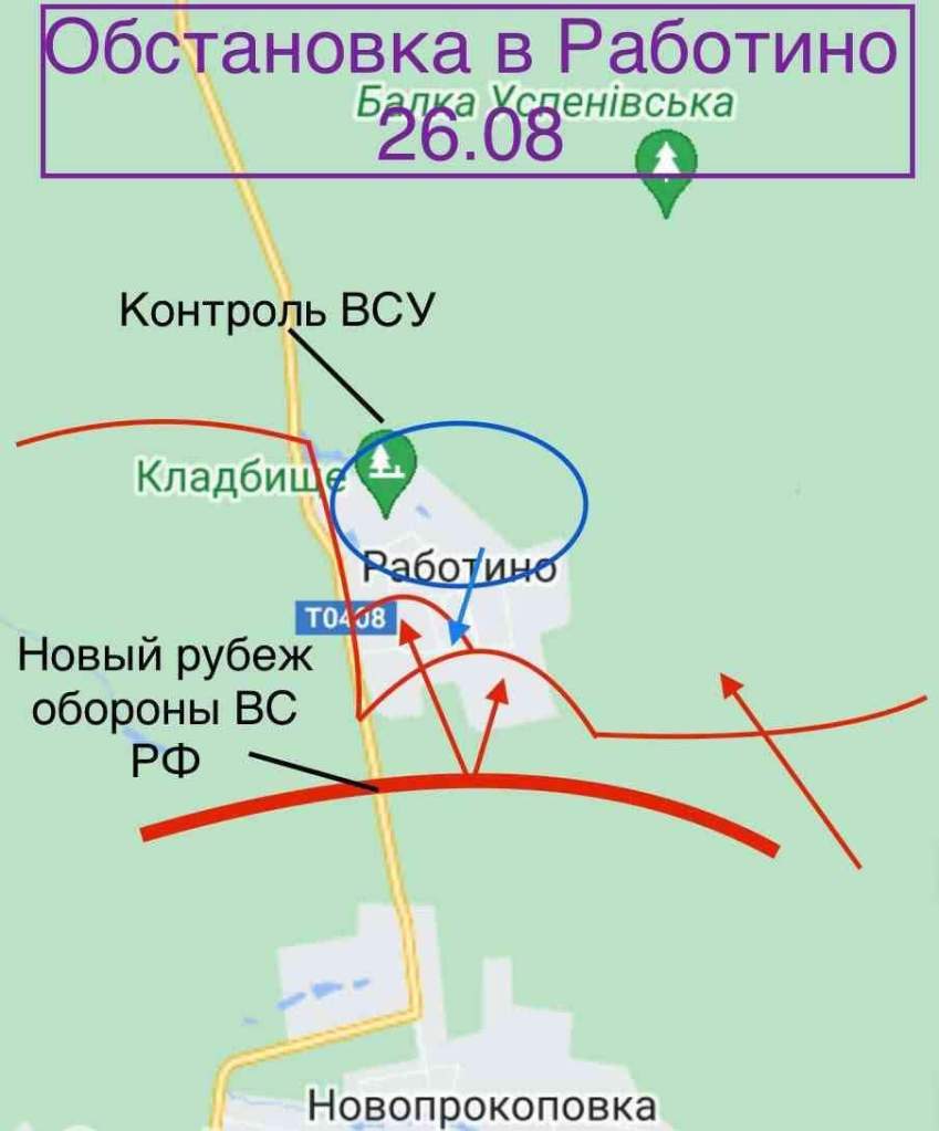 Ese es en materia de introducción para comprender porque hay cosas que se hacen y otras no, definir lo principal y el esfuerzo principal, lo del sur, ese frente de Zaporizhia, donde está Robotino. Es un pequeño asentamiento, dejaré la foto en la foto del TOM, de aproximadamente 1.5 km2, sí, 1 km y medio, aquí se explica la importancia del mismo: