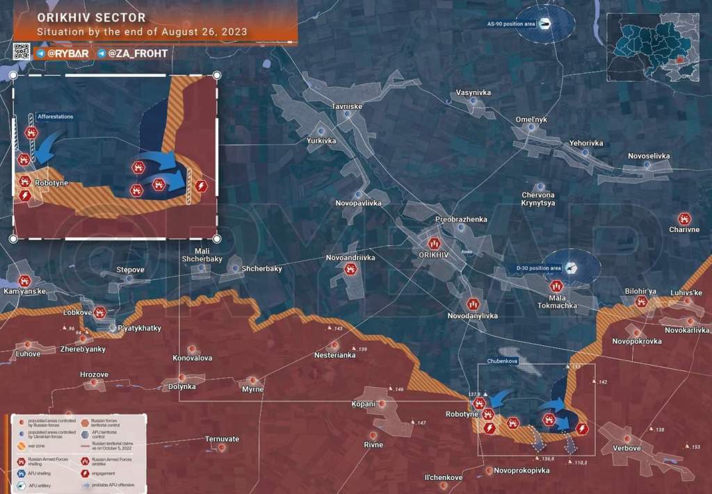 Precisamente hoy, esta es la situación del lugar. Combate intenso en la zona gris de Rabotino. En Rabotino se están librando intensas batallas de alta intensidad. Así lo informó el presidente del movimiento «Estamos junto con Rusia», Vladimir Rogov. Nuestros muchachos están contrarrestando a las Fuerzas Armadas de Ucrania con FAB e incinerando a quienes intentan ingresar a la parte sur del asentamiento con TOS.