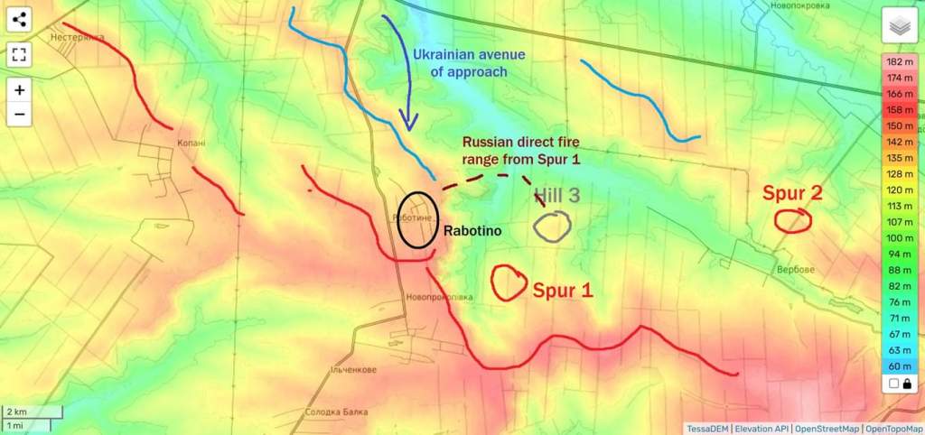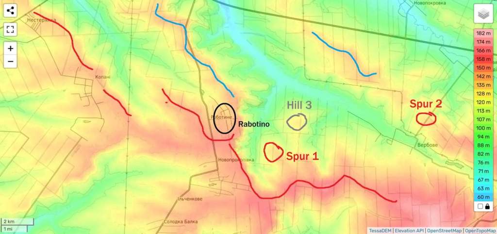 Está todo en las líneas intravenosas. Aquí hay un mapa en relieve de los alrededores de Rabotino, con las líneas IV rusa, ucraniana e «internacional» marcadas. Los ucranianos pudieron acercarse a la ciudad tomando las líneas IV del norte y disputando la colina 3. La colina 3 es en realidad bastante importante porque los rusos no pueden usar efectivamente fuego directo detrás de la línea IV centro-norte desde Spur 1 o Spur 2, aunque pueden observar el fuego de artillería, ¡que han estado usando de manera muy efectiva!