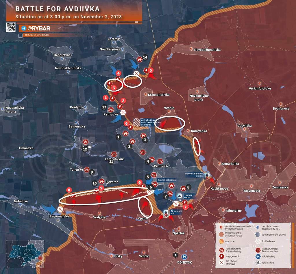 En Adviivka, entre ayer y hoy se avanzó significativamente. Tanto en el norte, hacia el norte de Adviivka, y hacia el sur en dirección de Adviivka, es decir, amplían en el territorio en dirección contraria, sin dejar de acercarse también a Adviivka. Desde el sur, y este, los mismos movimientos, salvo el este, que sólo tiene que avanzar hacia el oeste.