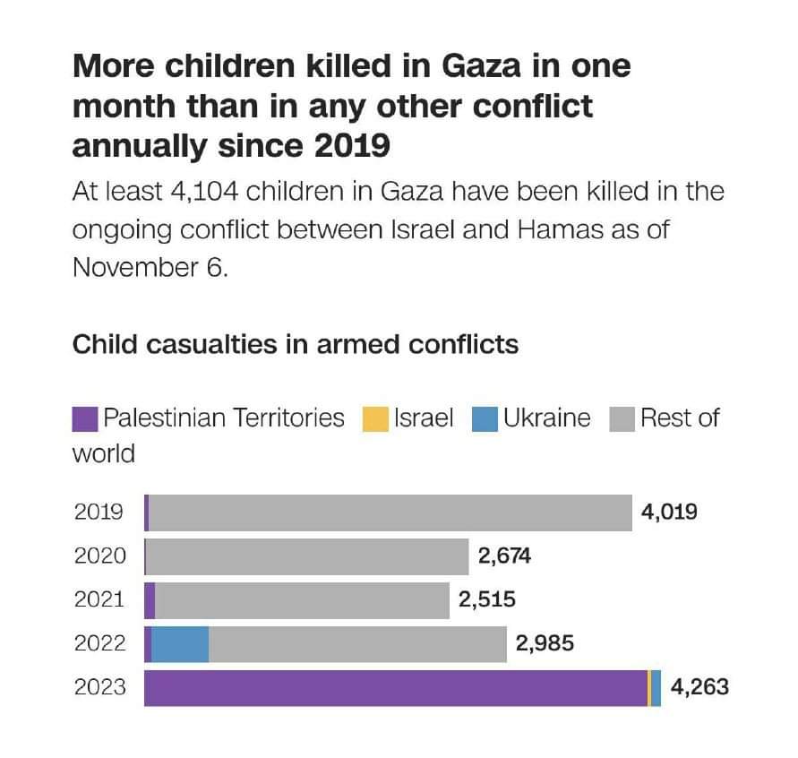 Foto: La cantidad de niños asesinados en la Franja de Gaza es mayor que en cualquier conflicto desde 2019, escribe CNN. Durante el mes de la guerra murieron aquí 4.104 niños. Lo que representa poco menos de la mitad de todas las muertes en Gaza.